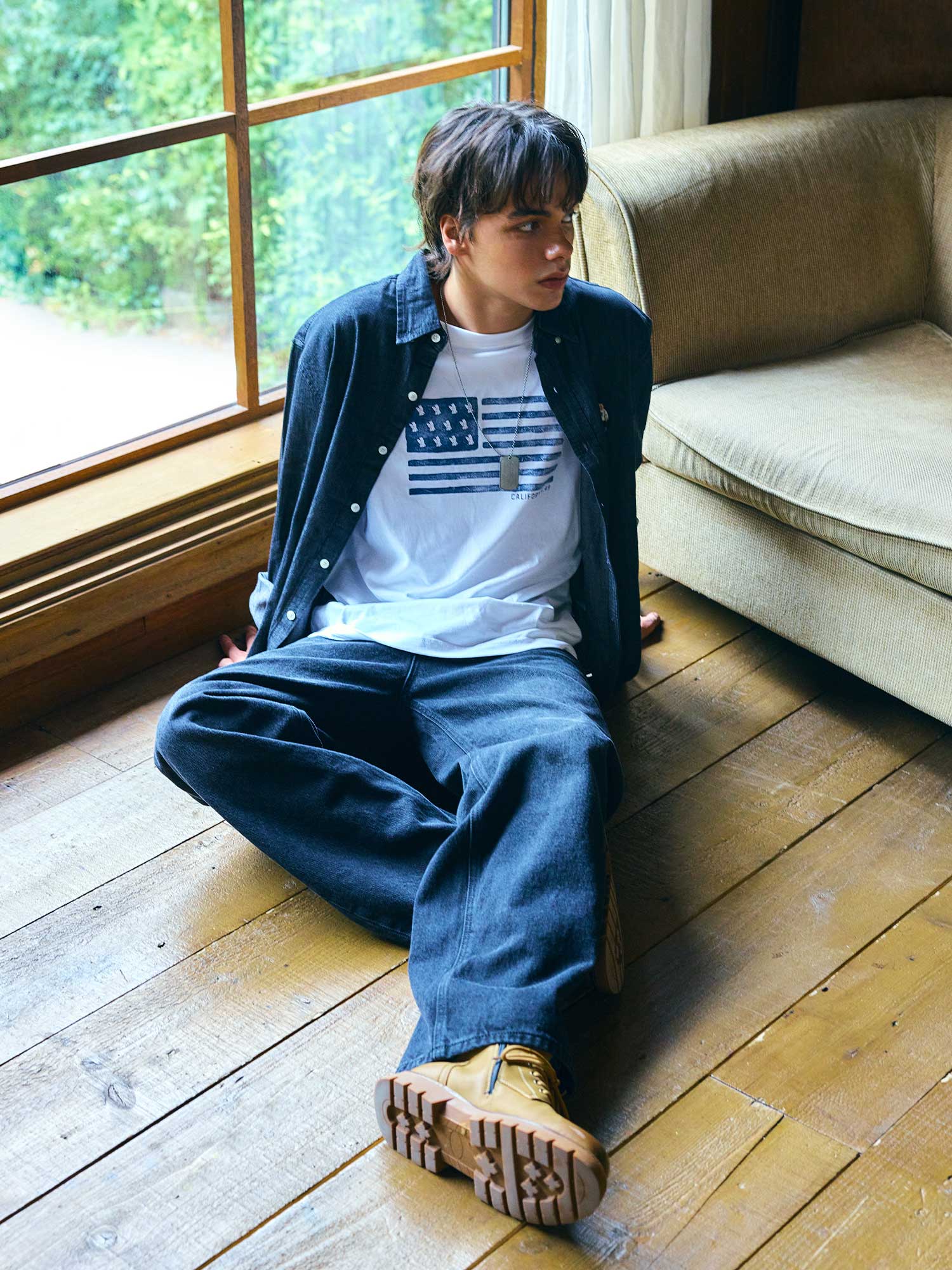 Trong ánh sáng tự nhiên bên khung cửa sổ, chiếc Wide Denim Pants trở thành nhân vật chính cho xu hướng quần dáng rộng – phong trào đang trở lại mạnh mẽ trong thời trang nam. Không còn sự gò bó của skinny jeans, quần denim ống rộng mang đến sự thoải mái tối đa mà vẫn giữ được sự chỉn chu cần thiết.