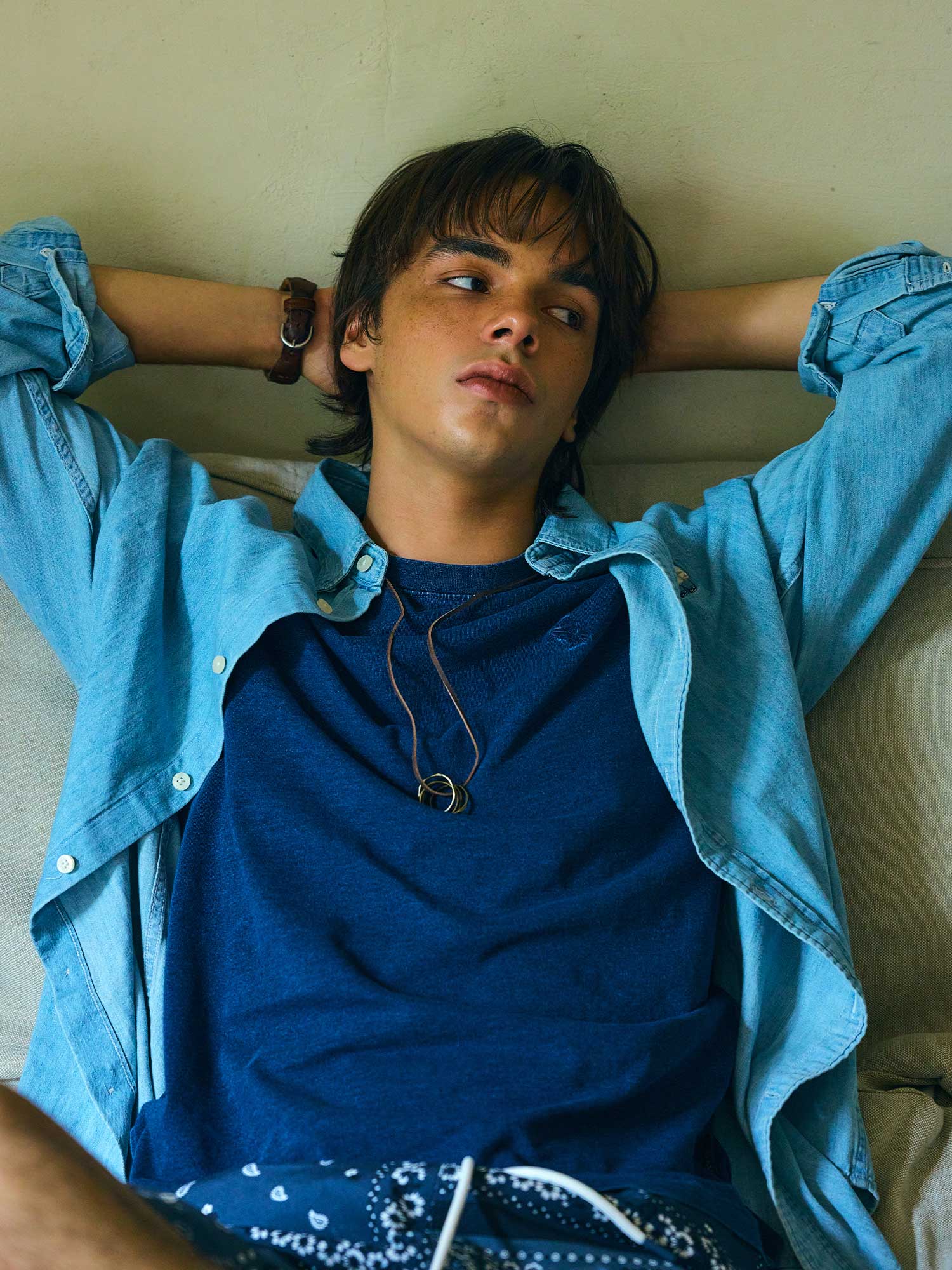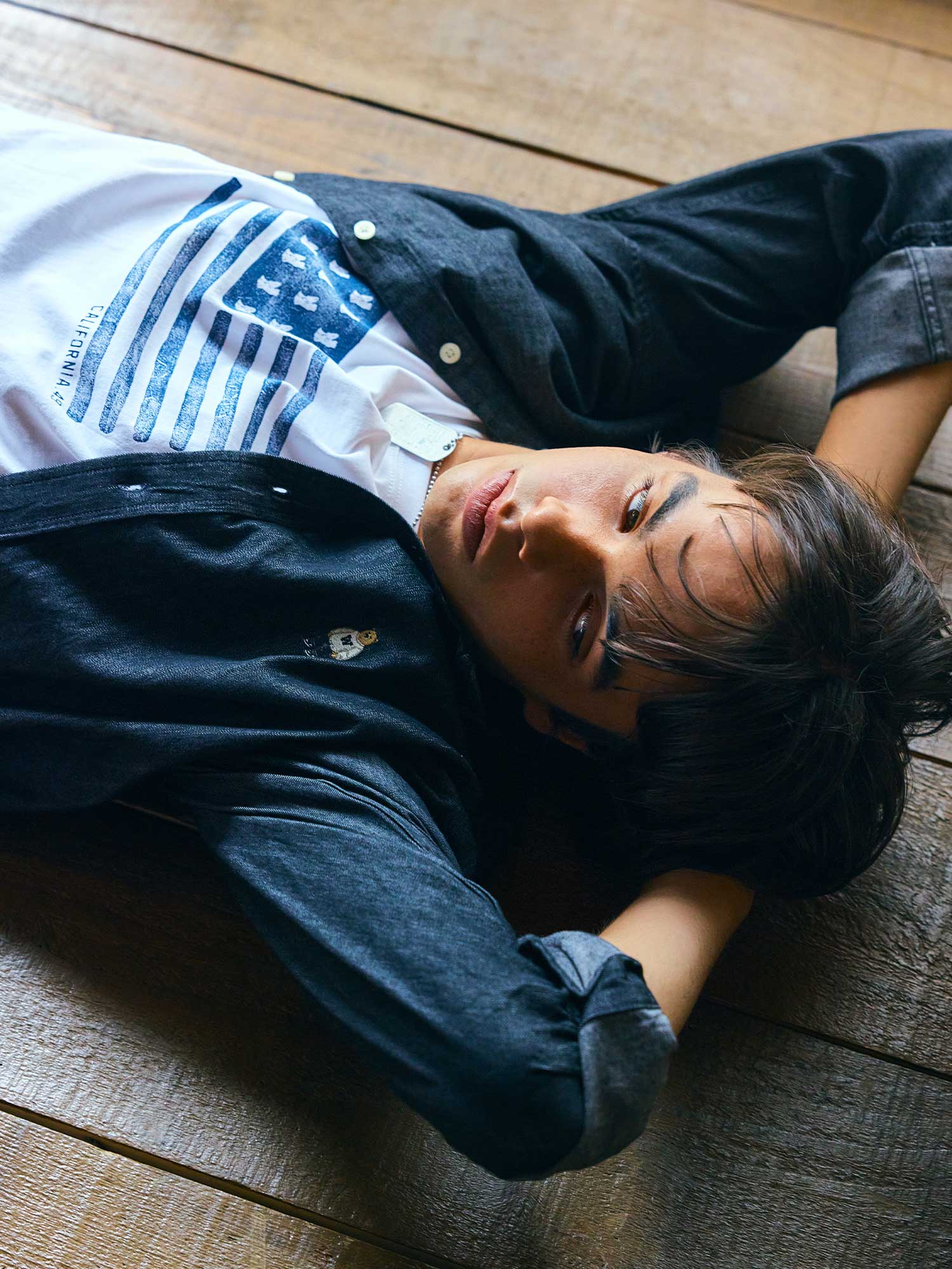 Hình ảnh chàng trai ngả lưng trên sàn gỗ, khoác hờ chiếc Steve Denim Shirt, gợi nên cảm giác thư giãn tuyệt đối. Nhưng chỉ cần đứng dậy, chiếc áo này lập tức biến thành điểm nhấn phong cách. Được may từ chất liệu denim mềm nhưng vẫn giữ phom, chiếc sơ mi xanh navy trở thành lớp áo khoác ngoài lý tưởng cho áo thun basic.