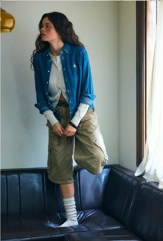 Tiếp đó, Semi Wide Denim (F) lại mở ra một chương khác của câu chuyện denim. Quần ống suông rộng vừa phải, tạo nên sự cân bằng giữa hiện đại và retro. Điều thú vị là khi phối cùng Western Point Jacket, cả set denim-on-denim lại mang đến một tinh thần cực kỳ phóng khoáng. Đây chính là “uniform” của những ngày muốn để tâm hồn tự do, mặc kệ chuẩn mực, chỉ cần thoải mái với chính mình. Hình ảnh cô gái nghiêng mình trên sofa, dáng người uốn cong đầy ngẫu hứng, chính là biểu tượng cho sự giải phóng cơ thể mà denim đem lại.